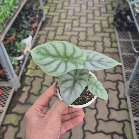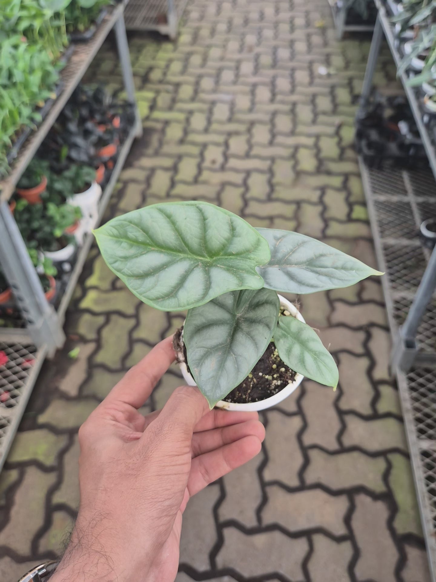 Alocasia 'Silver Dragon' is a rare and highly sought-after plant, prized for its stunning silvery-green, scale-like leaves with deep veining. Its compact size and dramatic foliage make it a standout in any plant collection.