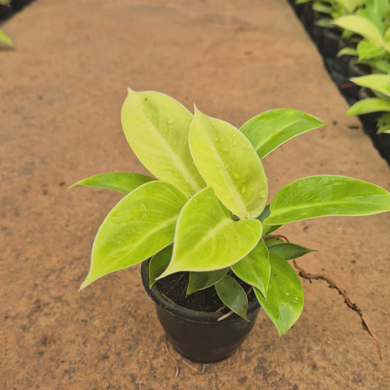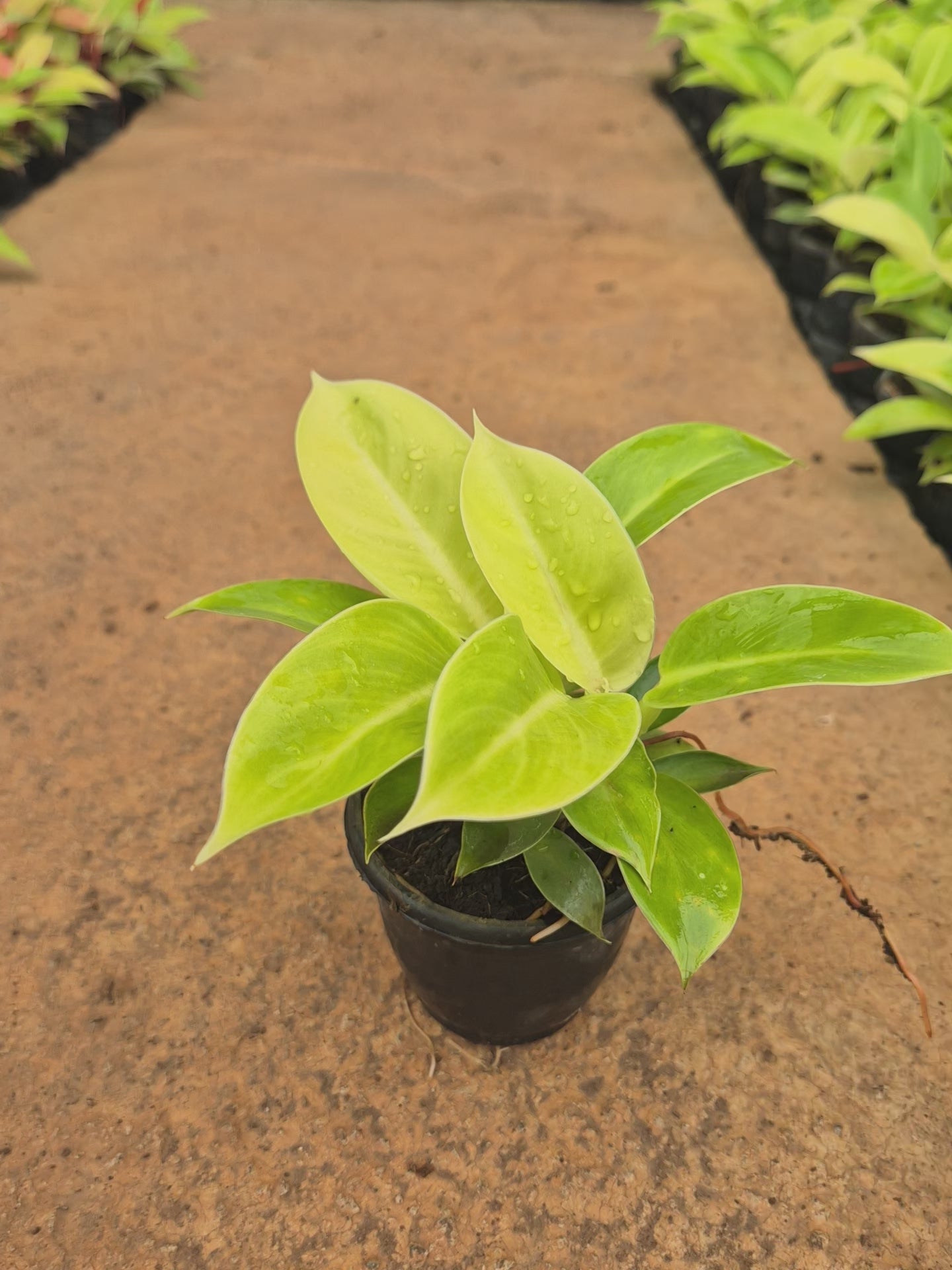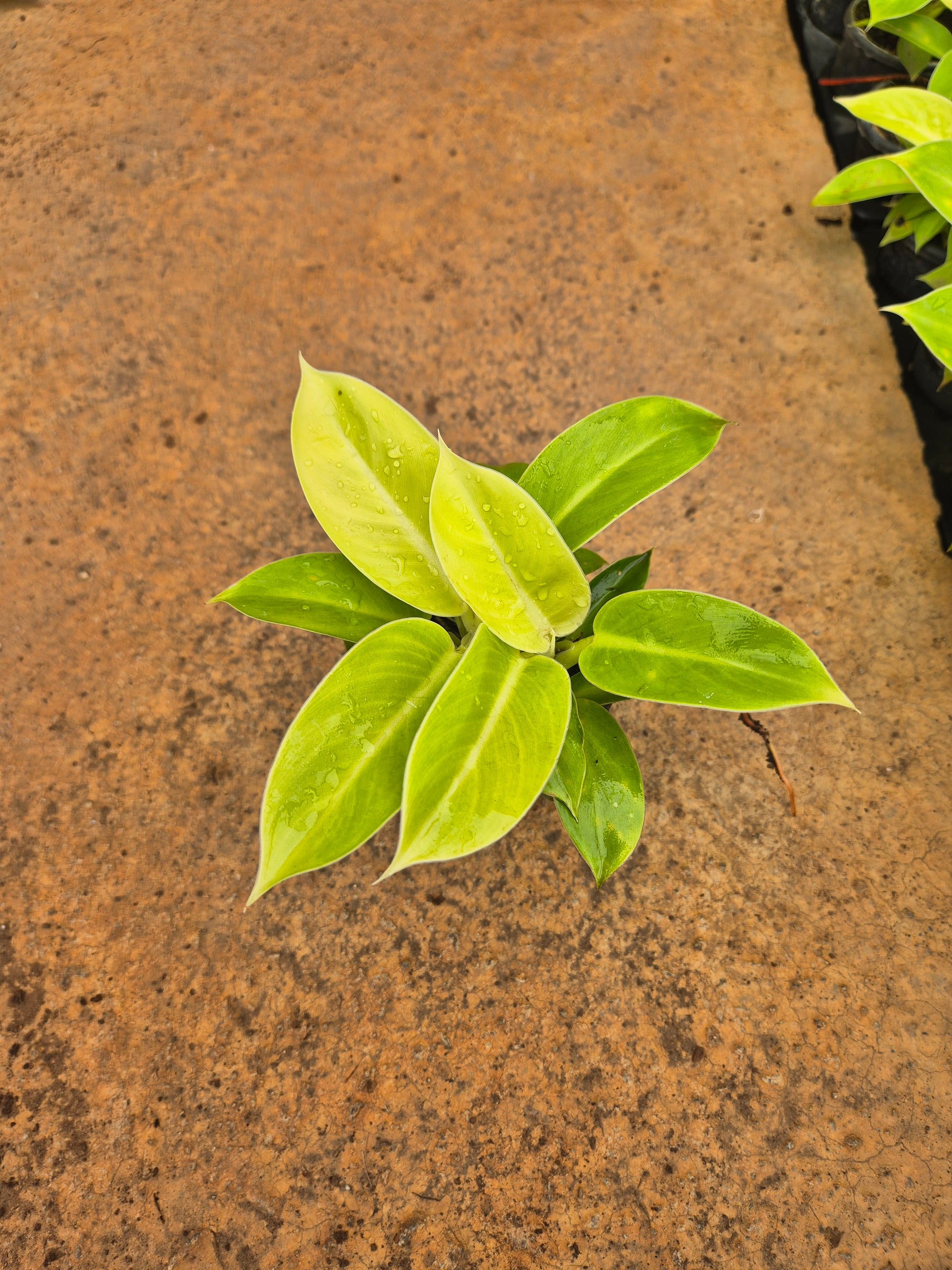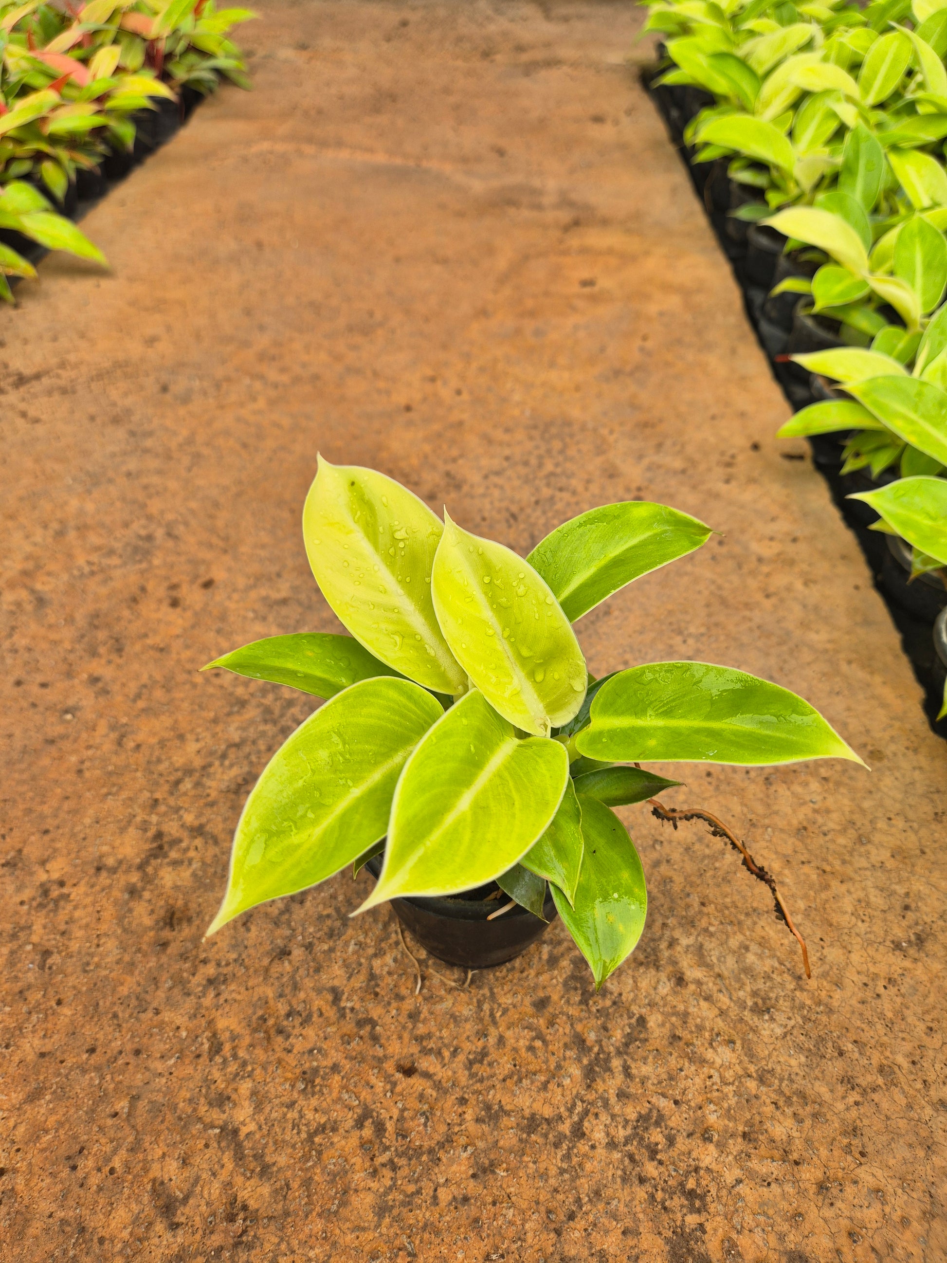 Philodendron Moonshine is a beloved houseplant that features large, oval-shaped leaves in bright green, yellow, and white tones.